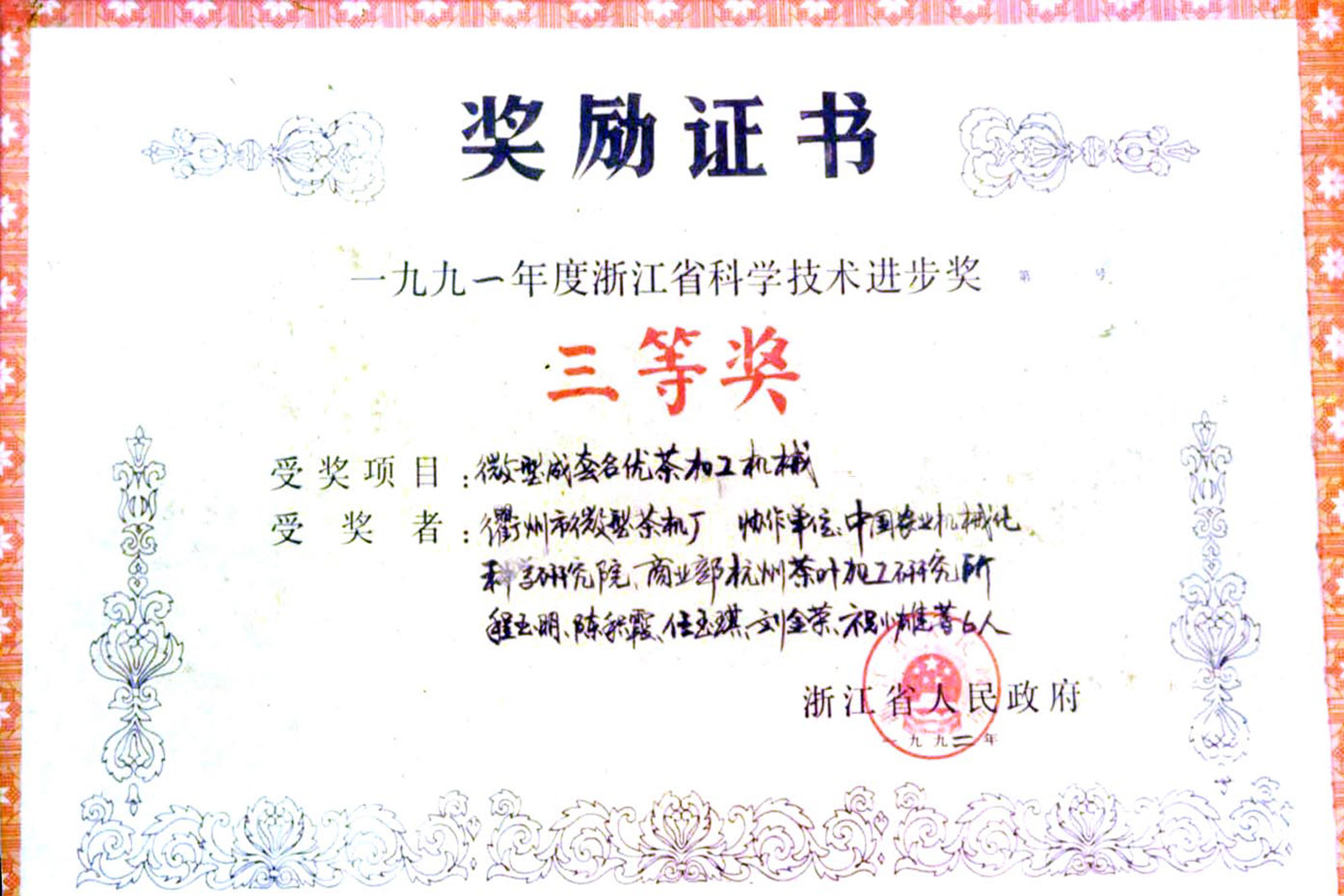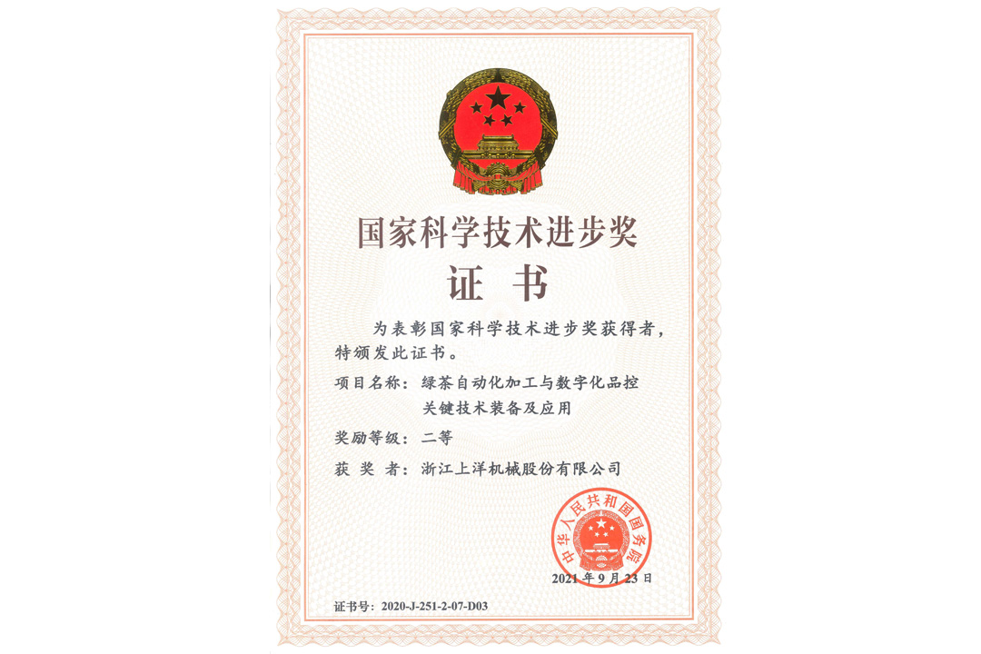 2021年11月3日,公司與安徽農(nóng)業(yè)大學(xué)等單位聯(lián)合申報(bào)的《綠茶自動(dòng)化加工與數(shù)字化品控關(guān)鍵技術(shù)裝備及應(yīng)用》獲得國(guó)家科學(xué)技術(shù)進(jìn)步獎(jiǎng)二等獎(jiǎng)。公司按照“品控?cái)?shù)字化-加工自動(dòng)化-技術(shù)體系化”思路,歷經(jīng)14年攻關(guān)和應(yīng)用,獲獎(jiǎng)項(xiàng)目技術(shù)及裝備推廣至我國(guó)所有產(chǎn)茶?。ㄊ?、區(qū))的 1200 多家茶葉企業(yè)。
