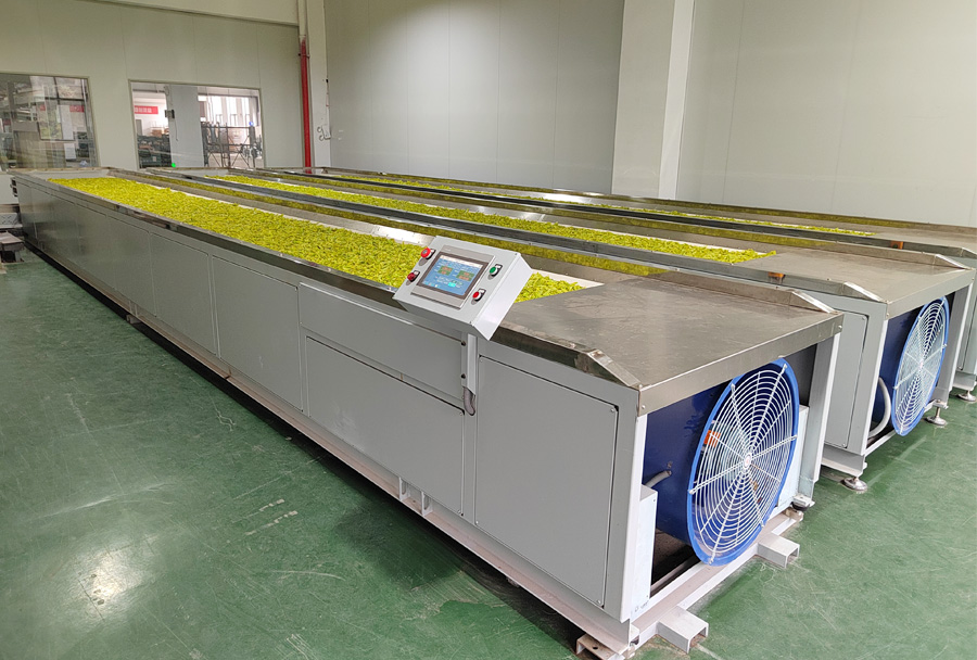作業(yè)原理:單層式結(jié)構(gòu),機組采用的集中控制系統(tǒng)可精準控制鼓風時間、風量、溫度、攤?cè)~厚度/重量等主要參數(shù),實現(xiàn)攤青(萎凋)的均勻充分。 利用光電定位系統(tǒng),能有效檢測茶葉流量,可自動控制茶葉進入下一步工藝流程。